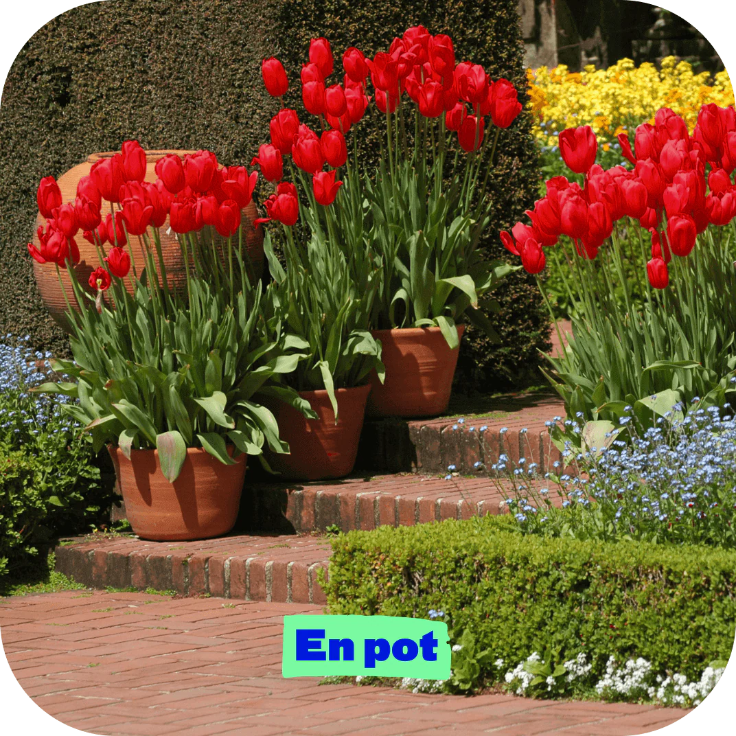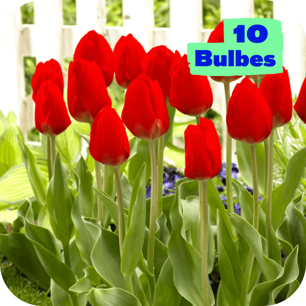 10 bulbes pour 10 sublimes tulipes rouges • Couleur : rouge amour flamboyant • Plantation : entre début octobre et décembre • Floraison : avril-mai • Hauteur : 55cm • Exposition : soleil et mi-ombre • Où ? en massif, bordure et pot Variété : Tulipe Darwin Hybride Parade, Tulipa cv.