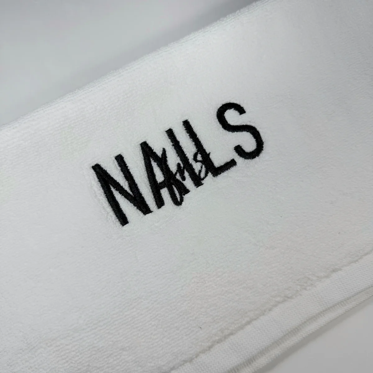 Serviette de manucure éponge en coton. Dimensions : 30 x 30 cm. Logo brodé. Lavable à 40° et passe au sèche linge.