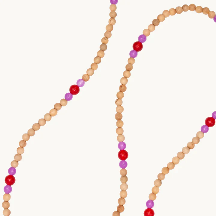 fabriquée avec des perles de bois et des perles en verre rose et rouge.