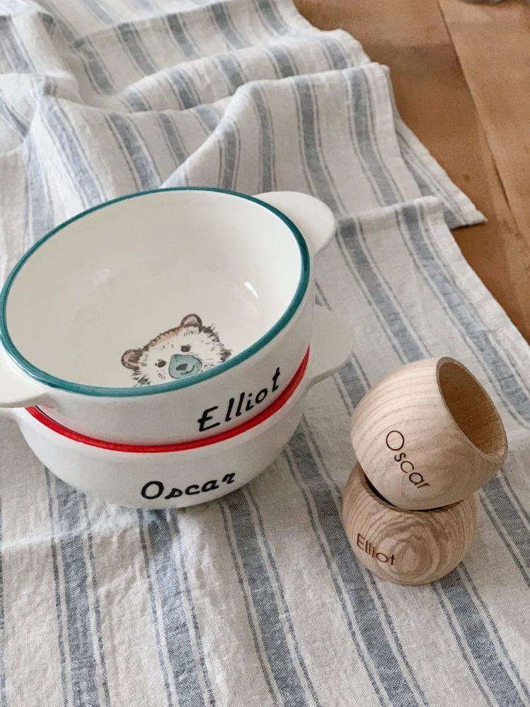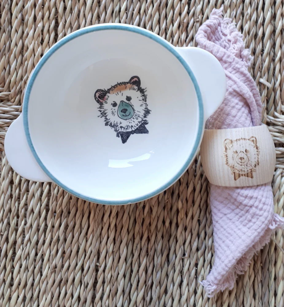 Bol Animal personnalisé Maison Roussot. Fabriqué et peint à la main en France. Bol en poterie culinaire. 2 modèles disponibles avec Inscription : « Grand Frère » avec motif Ourson dessiné au fond du bol / « Parrain » avec motif Perroquet dessiné au fond du bol Cette poterie peut parfois “tressaillir” avec les changements de températures: petits traits […]