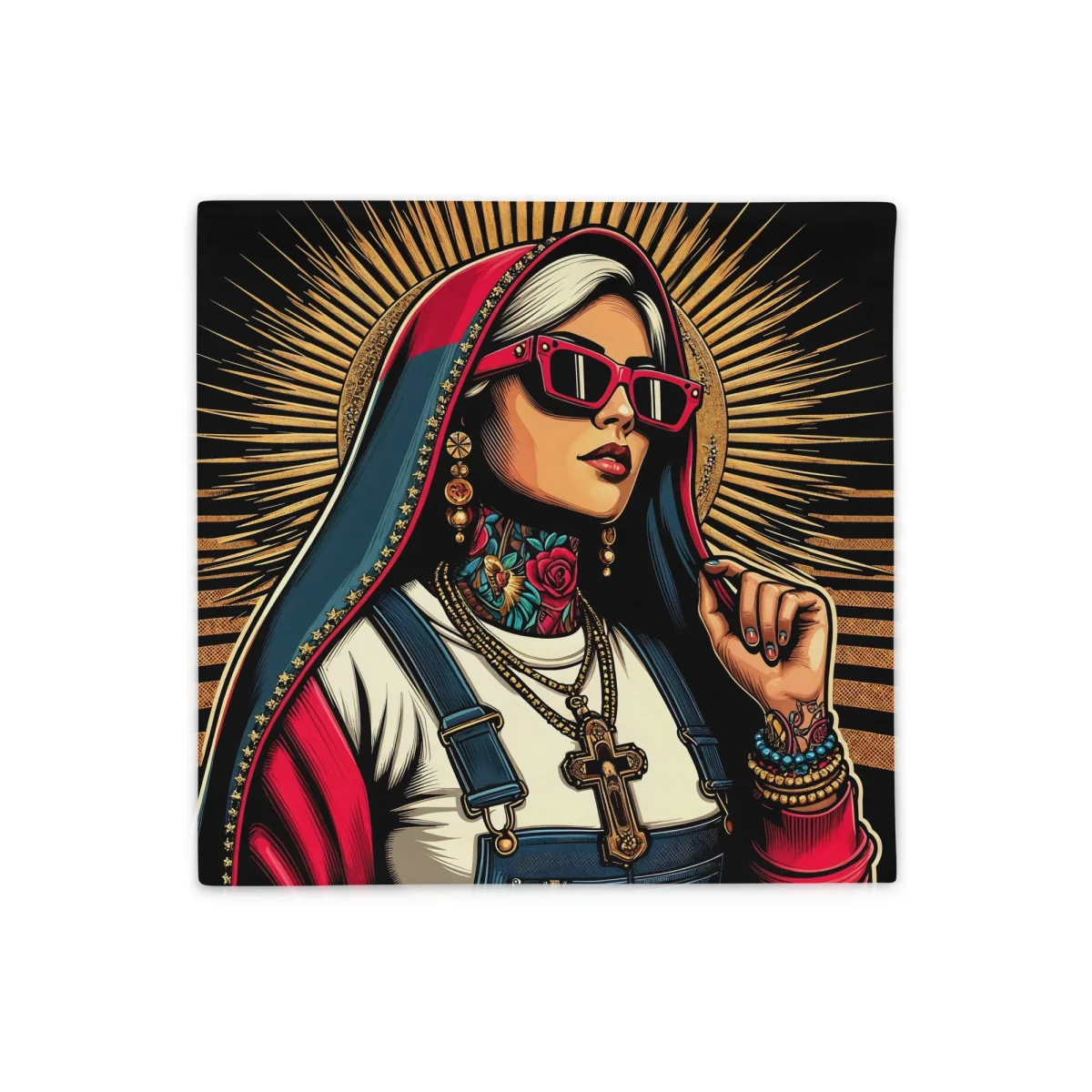Housse décorative satinée 45cm – Amateurs d’univers singuliers, vous aimerez la série POP MARY, où le sacré dialogue avec l’humour contemporain dans une audacieuse réinterprétation. Ces housses de coussin transcendent les époques, mêlant l’héritage iconographique de la Vierge Marie aux codes disruptifs du pop art et du street art.