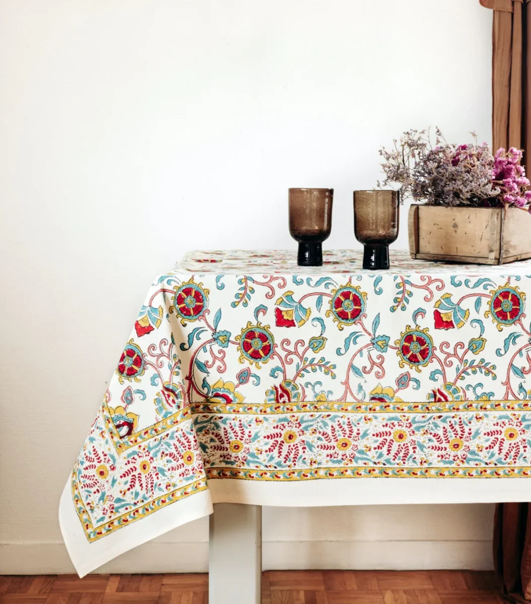 Nappe rectangle JAMINI en coton imprimée à la main par des artisans experts en Inde dans le plus grand respect des traditions indiennes.