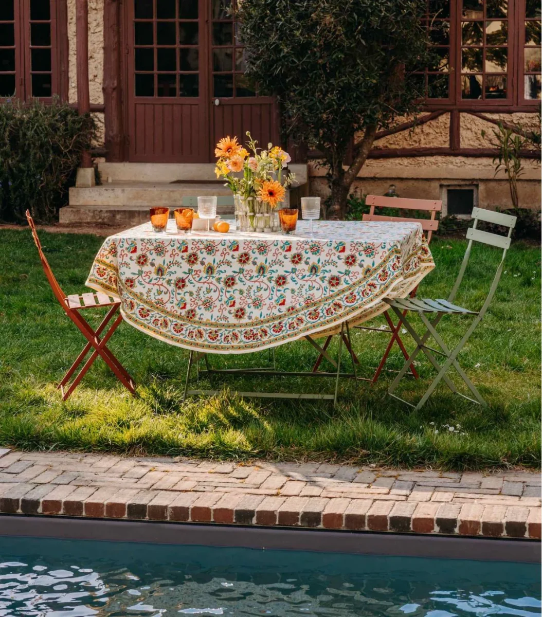 Nappe ronde JAMINI en coton imprimée à la main par des artisans experts en Inde dans le plus grand respect des traditions indiennes.