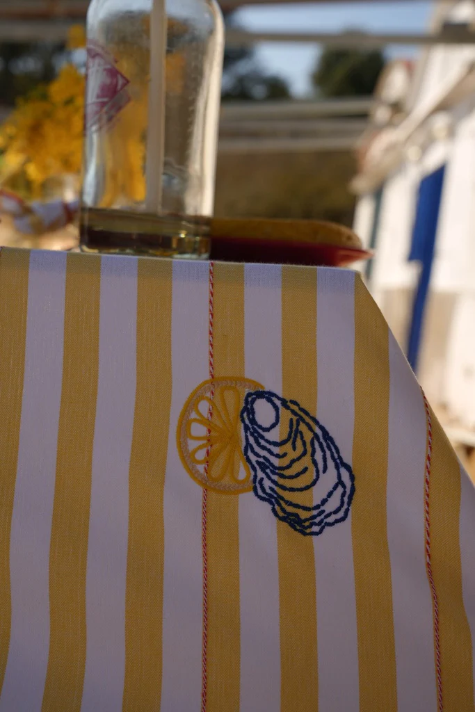 Nappe en coton tissé, brodée de homards, d’huîtres et de citrons.