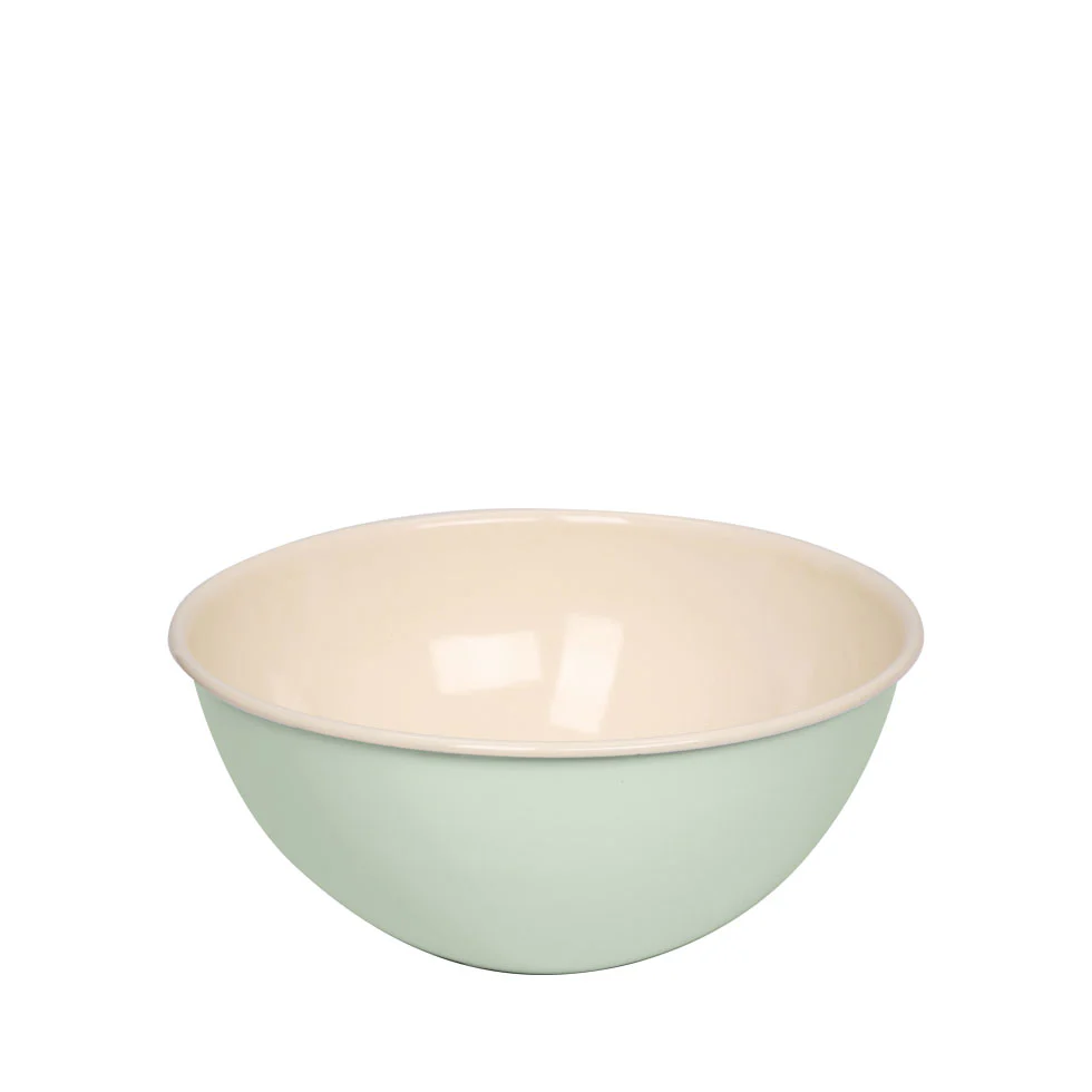 Saladier en émail vert pastel à l’extérieur, crème à l’intérieur.